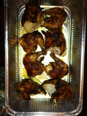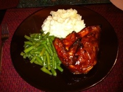 Next came my contribution to this tender goodness. I decided that garlic mashed potatoes and green beans would compliment the plate perfectly. It was all rounded out by a honey barbeque glaze the hubby slathered on the chicken. Voila…dinner is served!
