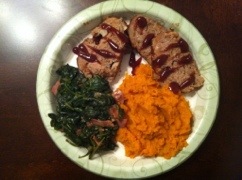 However, nowadays products are not manufactured the same as they used to be and many people aren’t as active as they used to be. Foods that our ancestors used to eat all the time and stay thin are now causing an epidemic. The key is to use quality ingredients like they did. I decided one day to “remix” one of our favs. Instead of BBQ ribs, candied yams, and collard greens with ham hocks; I opted to make a BBQ turkey meatloaf, sweet potato, and sautéed spinach! Delicious!!!!