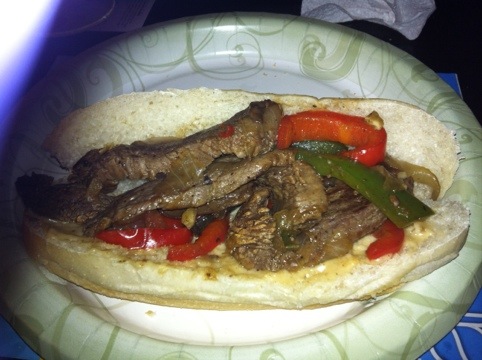 That meant I had to make my own. Although the original masterpiece is delish, we all can’t eat that stuff all the time. I still used my roll, but I hollowed it out for 2 reasons – #1 – so there was less bread, and #2 – so the meat would sit all cozy in the roll. The meat was tender and the onions, mushrooms, and peppers were lathered on. Finely, came the cheese. I used a provolone but I made it into a cheese sauce. It was light, creamy, and still flavorful. My husband loved it! It was nice to taste that steak sandwich again…so thank you to that cab driver that told the Oliveri brothers to sell that “steak sandwich”!!