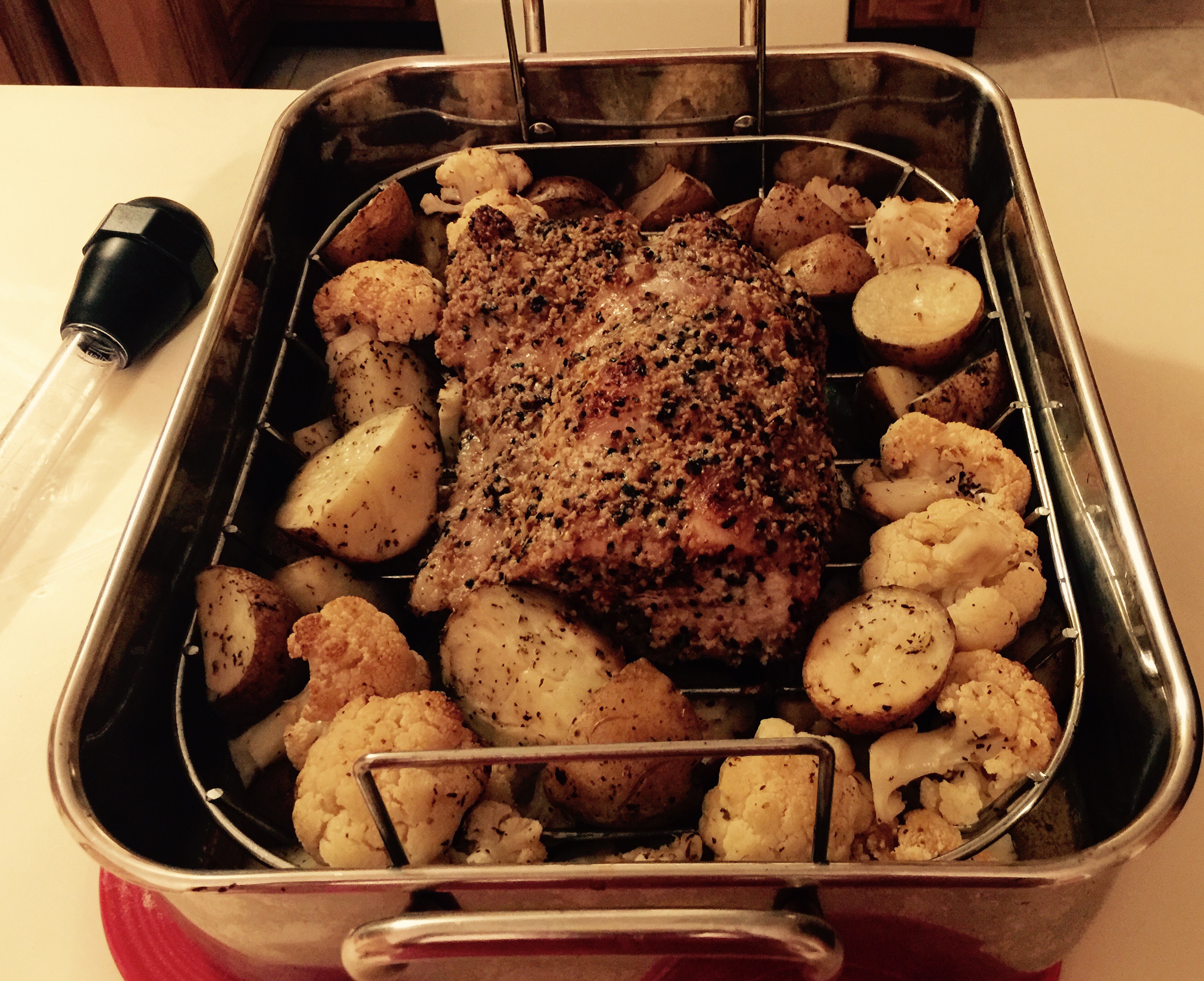 For my side, I cut up some potatoes and fresh cauliflower and drizzled with olive oil. I also created my own herb seasoning using salt, black pepper, garlic, thyme, rosemary, oregano, basil, and onion powder. To make it simpler, you can just use Italian seasoning if you have that. I sprinkled the mixture over my veggies and tossed. Once completed, i poured a little stock (you can use vegetable or beef) in the bottom of my roasting pan to fill the bottom. Then, I arranged the potatoes and cauliflower all around the tenderloin. I covered it and put it in a 400 degree oven for about 1 1/2-2 hours and then removed the foil. It then went under the broiler for a few minutes to get that nice color. Let it rest for about 15 min and….voila!