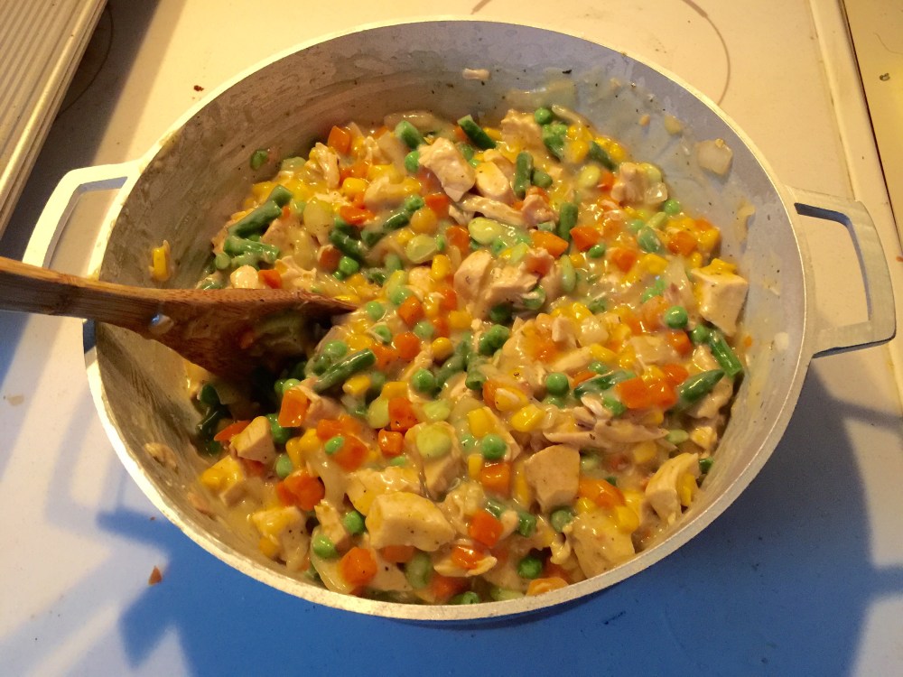 All these ingredients should be married in your pot together. Be sure to salt to taste! You may need to thin it out a little because it is condensed soup. Use a good chicken stock for that. Now that flaky, butter crust…where does that come in you say? I know, that’s everyone’s favorite part. I love breaking it part into the pot pie and mixing it all up together! The best crust for me is puff pastry. Now this part is completely up to you. Are you a single or double kinda person? I’m talking about the crust that is! Some like crust on top only and some want it on the top and bottom. You decide! My husband loves top and bottom crust. My waistline…maybe not so much! 😩 My most recent creation is pictured below. Don’t mind the crust this time. I’m usually such a perfectionist but I had limited time. I know you all still love me!