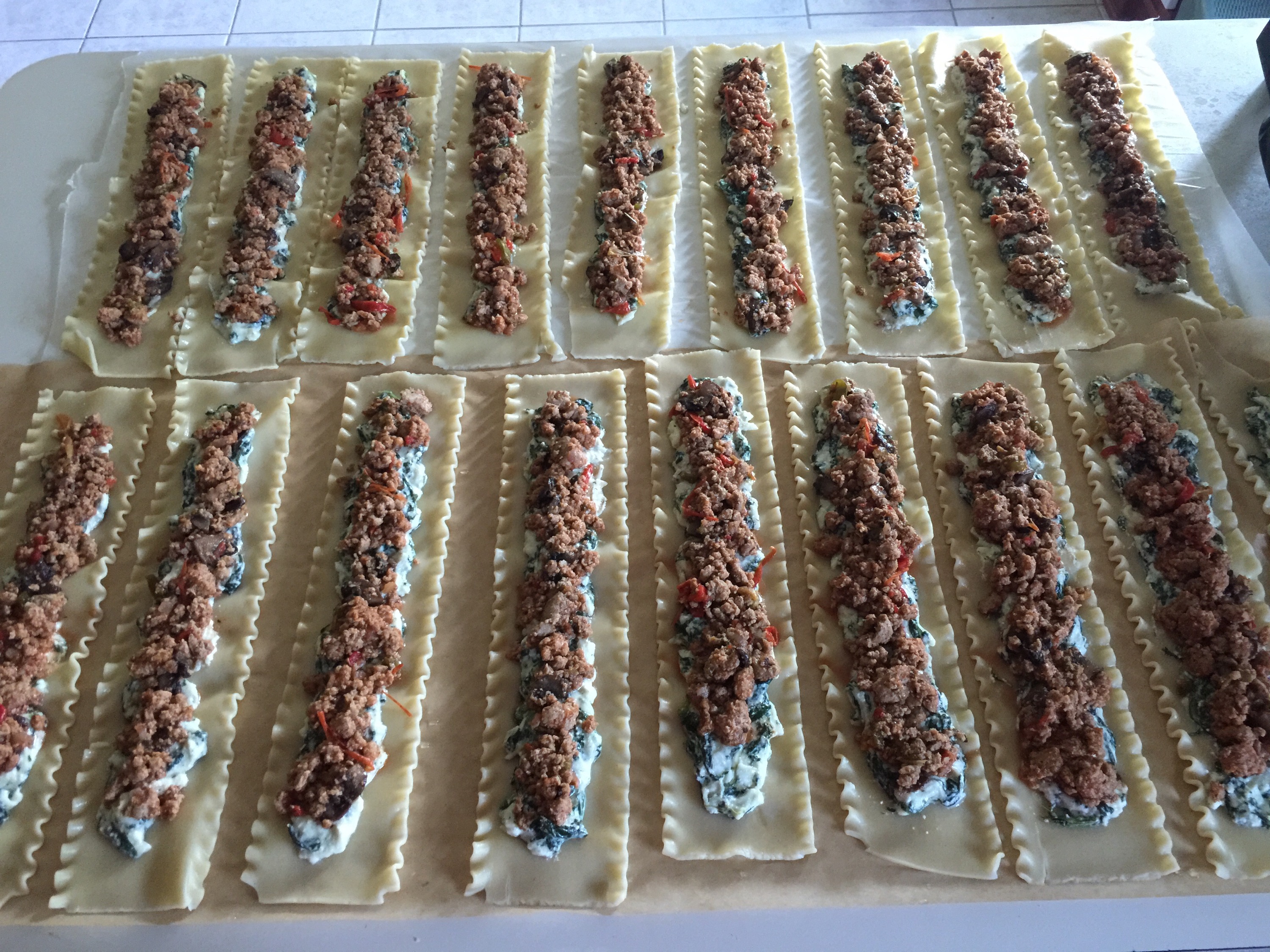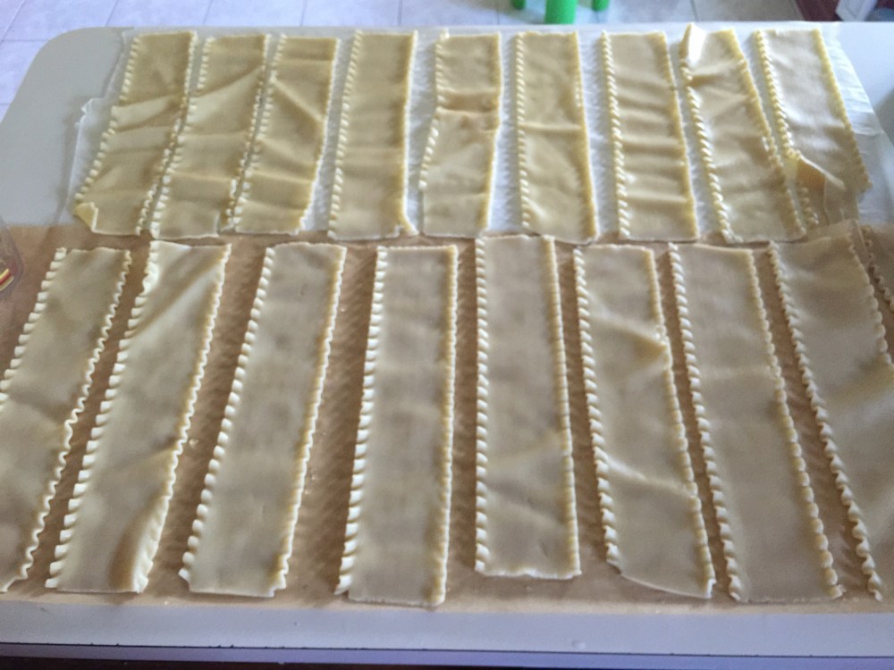 Your base will always be the same of course – lasagna noodles cooked al dente. If you over cook them, they will not hold up when it’s time to roll them up with filling inside. Once they’re done you want to lay them all out on your working surface. You’re going to need sufficient counter space to make this project go as smoothly and as efficiently as possible. And while you’re doing it, you may stop yourself and say “wow, I’m actually doing this?!” To keep your lasagna noodles from sticking and to allow the rolling process to go smoothly, lay them on parchment or wax paper.