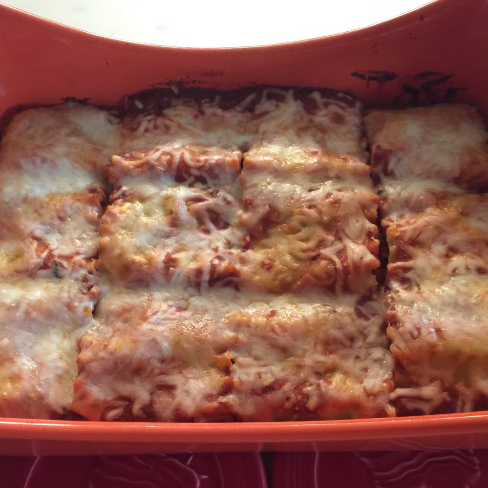 Once that was done you start rolling them up. You can use a homemade sauce or your favorite jarred sauce and place a little on the bottom of the pan and line up your lasagna soldiers. Once they’re nice and cozy in their baking home, cover the top with sauce as well and then sprinkle mozzarella over the top. Into the oven they go and once bubbly they come out like this…