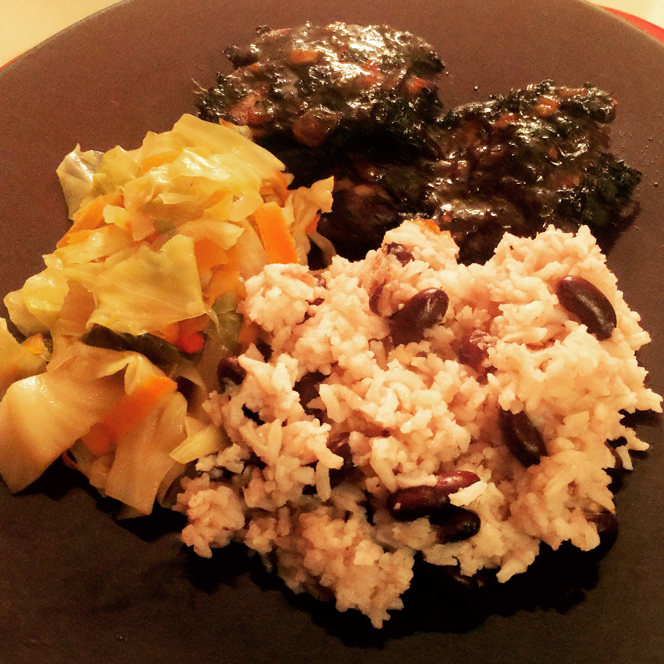 What did I serve on the side – rice and peas along with a cabbage medley. Rice and peas is a traditional Jamaican side dish made with coconut milk, spices, and red kidney beans (I know those aren’t peas, but that’s what we call it and it doesn’t change the fact that it’s DE-licious!). The rice takes on the hue made from the beans and milk and will be fluffy and tender. This is one of my favorite side dishes. Maybe some would be done then, but for me, the meal isn’t complete without the veggies! My cabbage medley consisted of cabbage, onions, red & green peppers, and carrots. Sauté everything but the cabbage and carrots until slightly tender, add the cabbage and carrots and let it steam until cooked to your liking. For my liquid to cook the veggies in, I used chicken stock. Provides so much more of a flavor punch than water. However, if you don’t have it, water will do. Add some butter (because everything is better with butter), salt and pepper to taste and you’re golden!!!