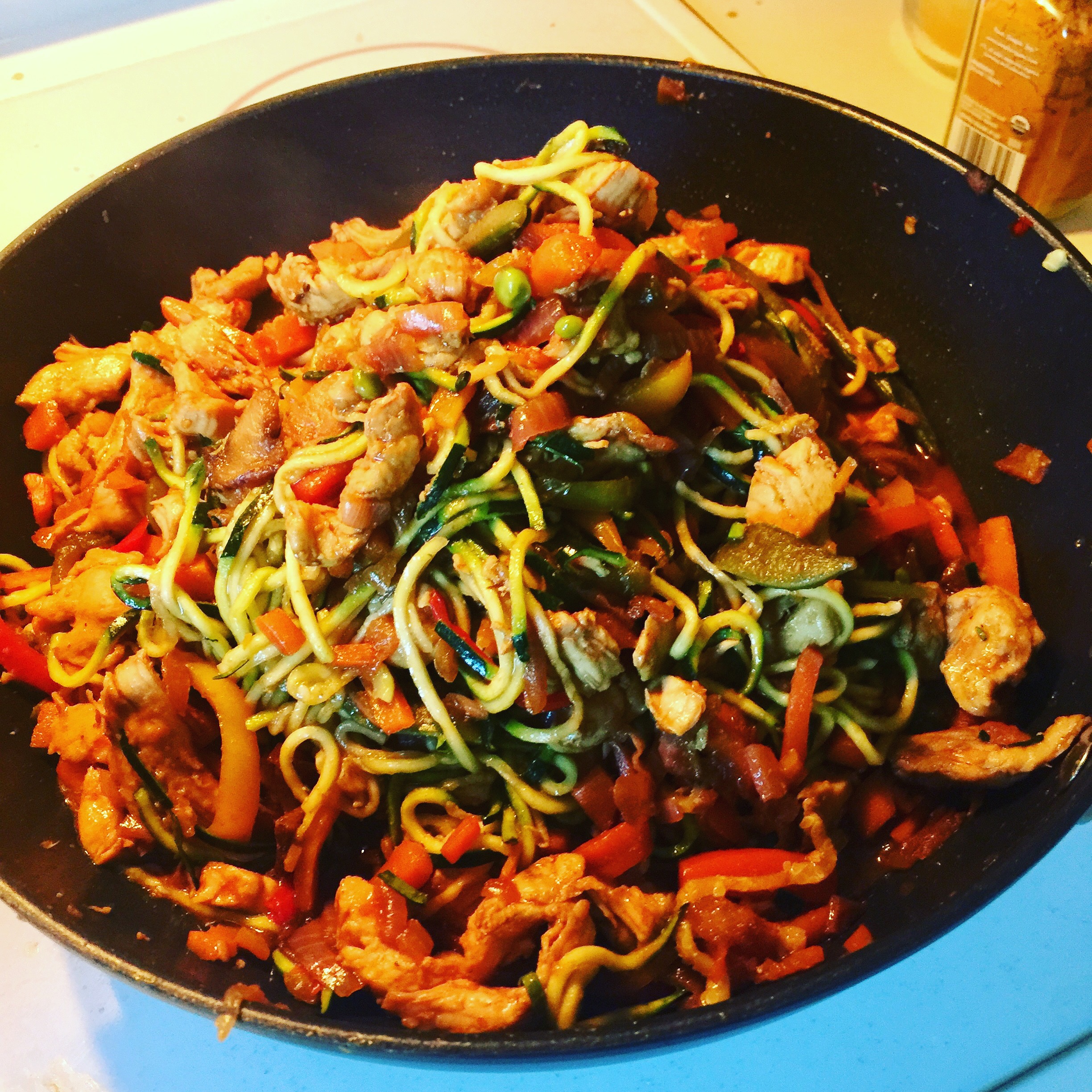 I took some chicken breasts (you can use boneless skinless thighs as well) cut them into thin slices and seasoned with sea salt, pepper, ginger, garlic, turmeric, and onion powder. I cook the chicken in sesame oil in my wok. Once done I pulled it out and started on the veggies. In the stir-fry I added red onions, mixed bell peppers, mushrooms, snap peas, carrots, and the zucchini noodles. Obviously you can’t leave out the soy sauce (Braggs liquid aminos can be substituted). It’s sooooo good and surprisingly hearty!